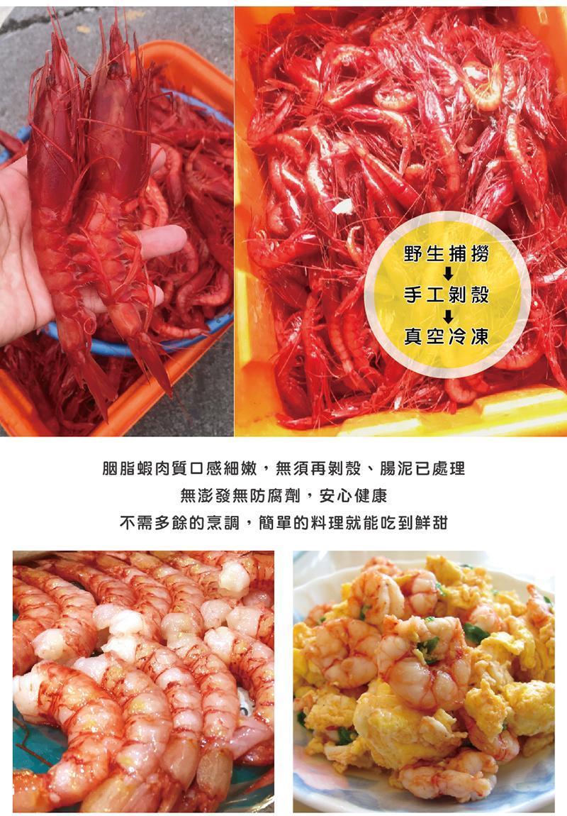 商品詳情 每隻蝦手工去殼,並且採小包裝真空。 適合小寶貝、年長者、食量小、或者家中的毛孩,都能安心用。 內容物:胭脂蝦 產地:台灣 重量:600g 適合料理方式:乾煎 【本產品含有甲殼類,不適合其過敏體質者食用】 *採真空包裝,不需剪開,隔袋泡冷水退冰,再取出料理。 *開封後以一次食用完畢為佳,避免反覆退凍影響品質。